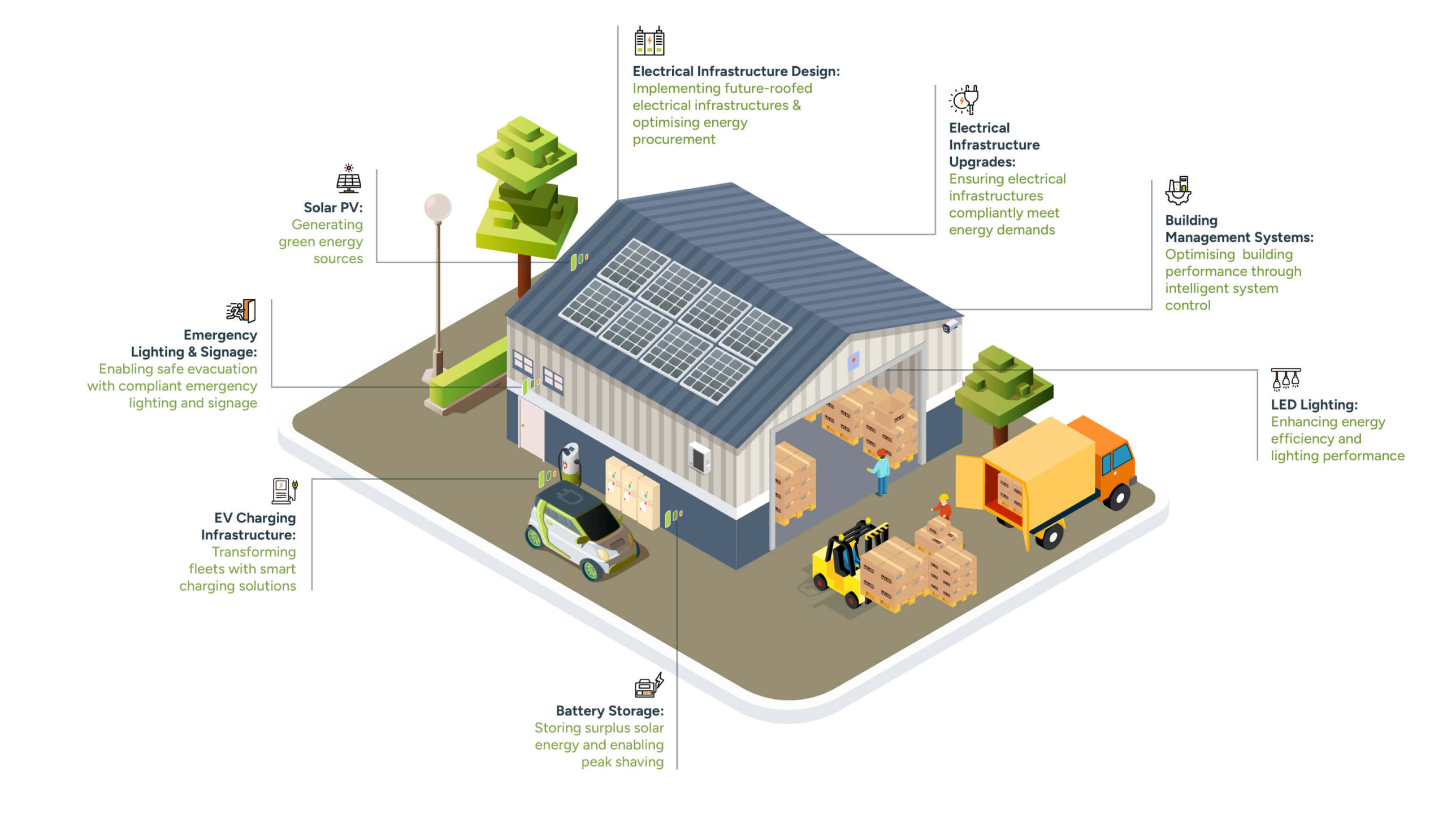 At FMSG, we’re proud to deliver a comprehensive range of electrical and renewable solutions built around the needs of modern businesses. Whether it’s energy-efficient electrical installations, EV charging infrastructure, or scalable solar PV systems, we tailor every project to your site, your goals, and your long-term sustainability strategy—helping you reduce costs, cut carbon, and futureproof your operations.